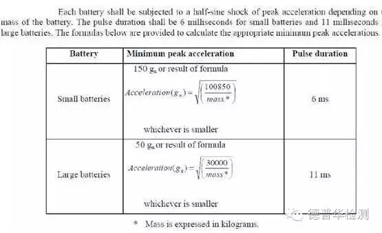 变化三:在38.3.4.4.2章节中,修改了加速度冲击的峰值加速度值,小电池超过4.48Kg, 峰值加速度会小于150gn,大电池超过12Kg,峰值加速度会小于50gn。